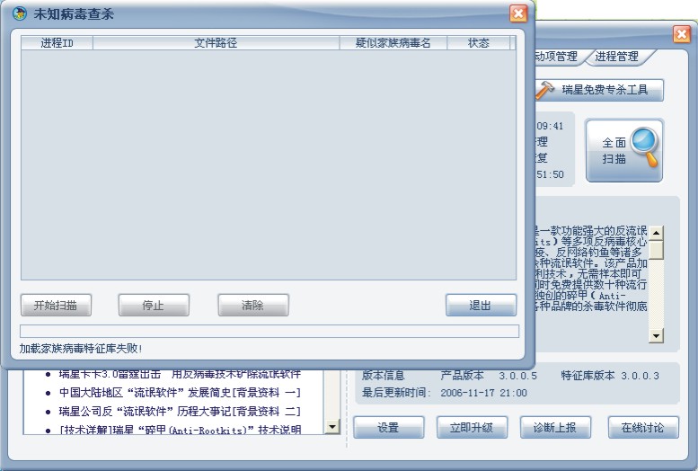 今天我升级到3.0.0.6,但是查杀未知病毒还是提示:加载家族病毒特征库失败!