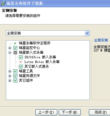 安装开始时我查看了安装组件.在瑞星嵌入式杀毒前的图标是灰色的,我看到有(IE/OFFICE嵌入杀毒  Lotus Notes嵌入杀毒  其它嵌入式杀毒),但我看到( Lotus Notes嵌入杀毒)前面是一个小红叉!其它的都是对号.不知道怎么样安装才对啊?我得怎样调试我的电脑系统啊?急啊!!