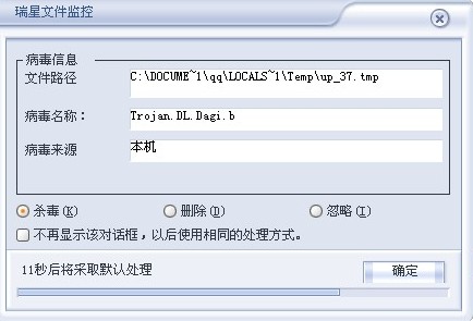 这个病毒老在是我打开网页时候出来`这 是出现在第一个`接着是第二个`当时瑞星就说已杀`删了``可是用不了几个小时`一开网页就又出来啦`显示的还是那个病毒`这个病毒里面的文件的数字变了一下`其它的全一样`我弄半天不中`我用的可是正版瑞星`真是郁闷死了``正版咋还杀不掉呀`都升级啦``没有办法我都抱着电脑从新做了系统全格了``回来又升级又杀毒``一开网页```完```