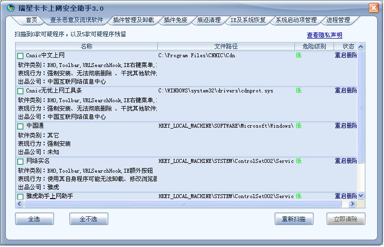 我使用的是3.0.0.8版本,每次查杀都提示重启后删除,但根本无法删除.