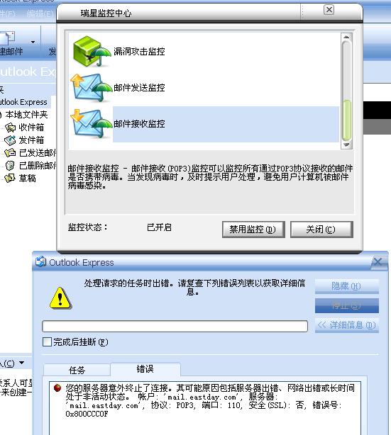 为什么我把瑞星2006的邮件监控打开,我的OUTLOOK就不能正常接收邮件和发送邮件???????????关掉邮件监控就可以发邮件和收邮件