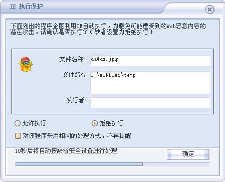 2.时不时弹出IE保护程序(见截图,文件都为同一个在dos下查看为da4ds.jpg文件),当第一次出现时先按拒绝执行,但在IE执行黑白名单内2栏都为空白;第2次出现时为了监测,按了执行,但报winrar crc解压出错,但在IE执行黑白名单内2栏也都为空白;最后一次执行,突然系统在后台安装程序,瑞星提示上报日志。