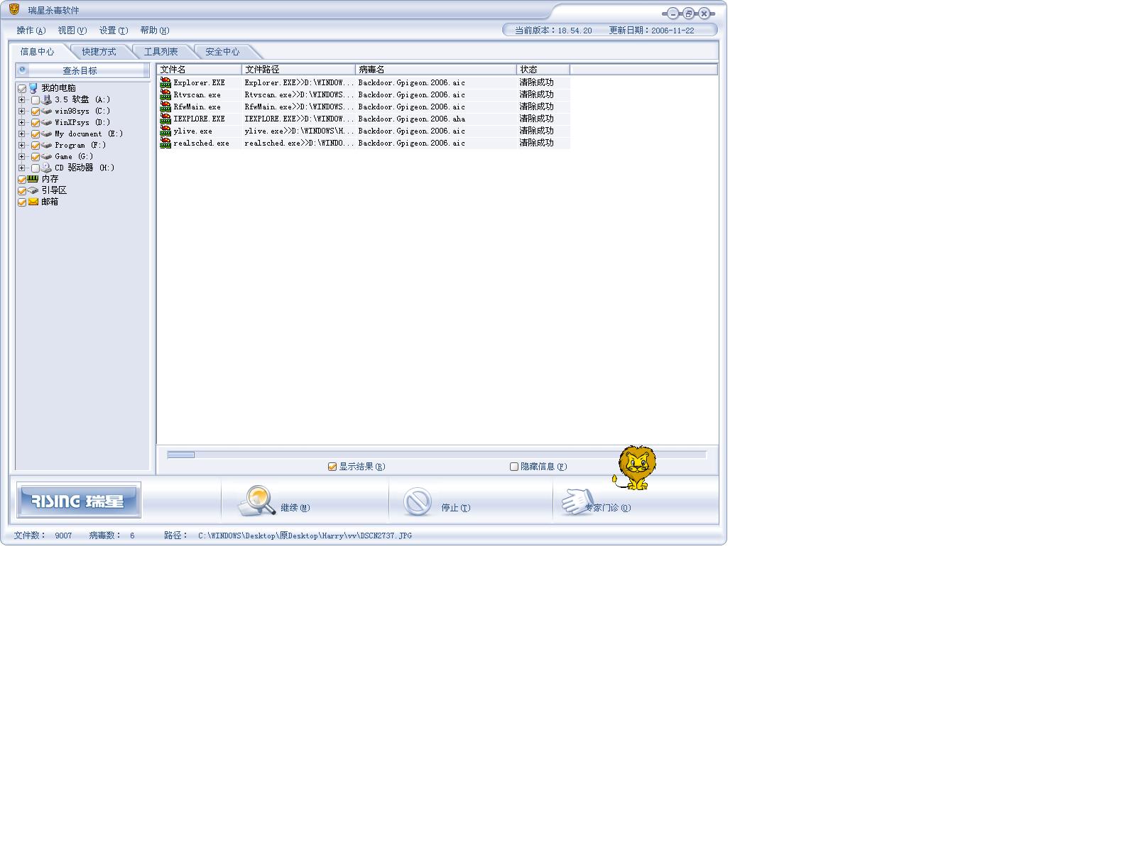 我的计算机用瑞星杀毒时报告:发现Backdoor.Gpigeon.2006.aic并成功清除.但再次开机后再杀毒又发现该病毒.请问如何彻底查杀该病毒?