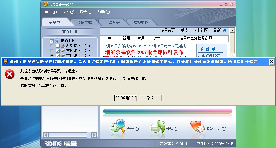 重装系统N次了,还是出现这样的问题!!!瑞星2007也太垃圾了吧.而且还搞个啥子鸟登陆前扫描,根本就不给用户选择安不安装,奉劝准备买瑞星2007的朋友还是不要买了!!!