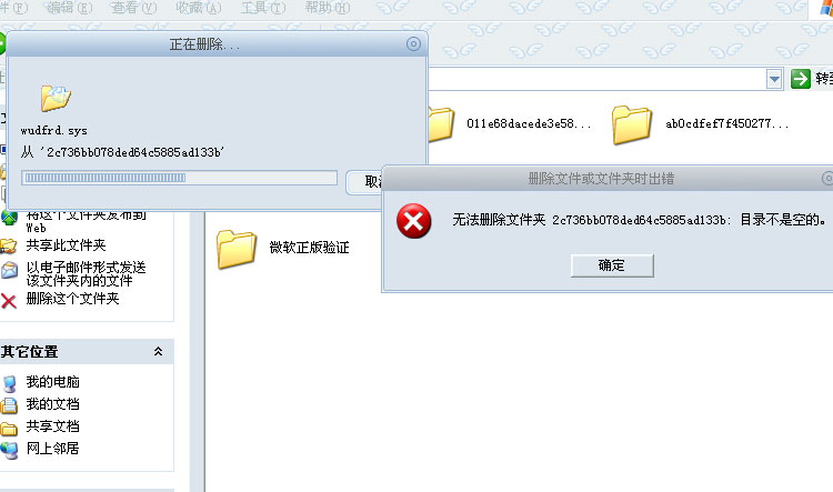 我的e盘里有几个 011e68dacede3e584399 类似名字的文件夹,里面都有一个 wudfrd.sys的文件。这些文件夹无法删除,删除时候显示 无法删除 :目录不是空的。 是不是病毒啊?有高手~帮我看看~先谢谢了!