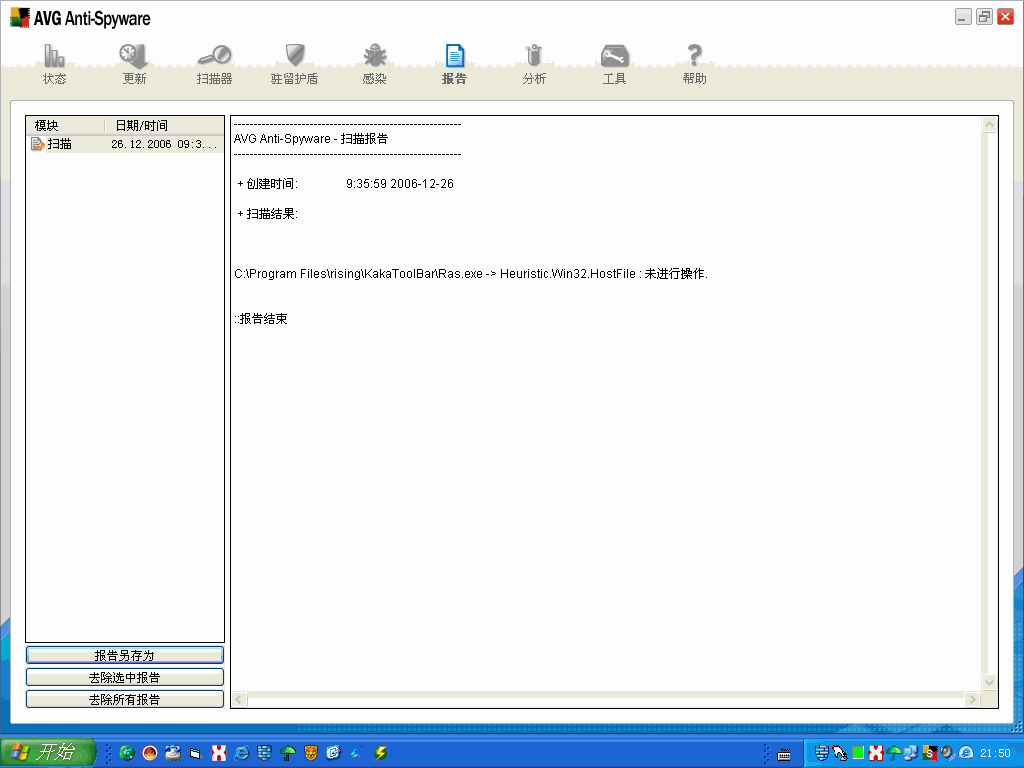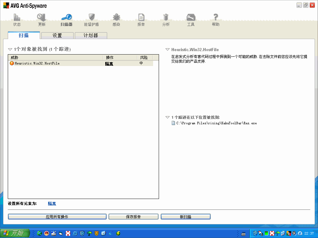 【各个故事上的贴子】世界顶尖的反木马软件AVG Anti-Spyware将瑞星防漏墙软件列为病毒!病毒名称:Heuristic.Win32.HostFile.图片如下: