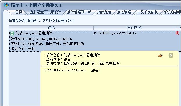 如题,我用瑞星卡卡的查杀恶意及流氓软件功能查出伪装Sun Java2恶意插件,删去后每次开机又有了。请问怎样才能彻底删除呢