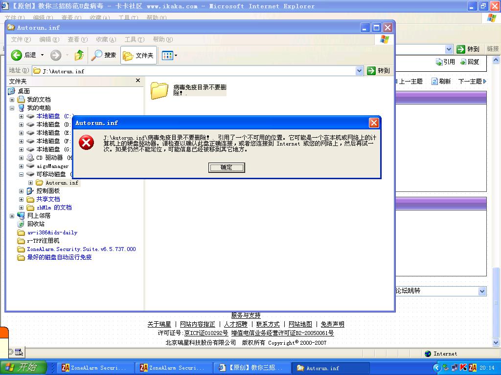 照着做了,优盘里多了个原本没有的"autorun.inf"文件夹夹,无法打开,出现如图的提示,这正常、有效吗???
