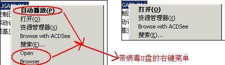 另外建议在移动硬盘插入你的电脑后 用鼠标右键看看有没有 auto 或者自动播放 或者browser等字样 (图1)如果有的话就很可能有病毒 此使用鼠标右键调用杀毒软件杀毒即可