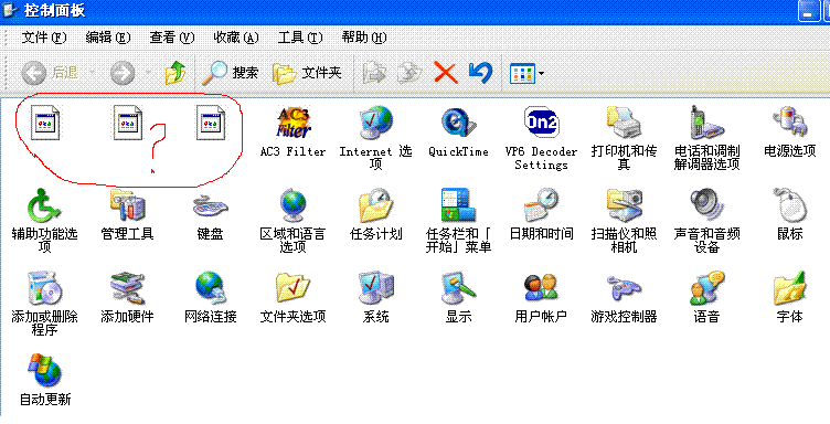 这个是来自控制面板的一个截图,其中三个图标没有文字说明(没有名称)也无法打开,更可气的是添加或删除程序也打不开,请帮我看看该咋办。