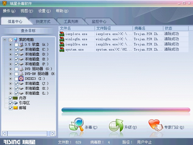 TNND中完毒瑞星没招只好重装系统,刚浏览一个网页又中镖,瑞星根本没办法,人家病毒关你实时监控倒轻轻松松,这病毒出来也不是一天两天了,到处都有,一浏览一些网页就中。真不知道你们瑞星的技术人员天天是怎么骗饭吃的。这段时间瑞星用起来就象个没用的饭桶,随便什么病毒都能把他杀得死死的,最后没办法只有格盘重装系统。图在下面,瑞星自己看吧,每次杀完了重启又有,自动把声音调成静音,还有把你的实时监控给关了。还有一个病毒瑞星也查不出来,中了以后自动把桌面上的IE删了,搞了个IE的快捷方式,但一打开就出来一些乱七八糟的网页。我去自定义桌面里选时发现原来的IE选项已经不能选了。希望你们马上搞定这两个病毒,不要整天只会在主页上吹得冠冕堂皇。我一直都是正版用户,所以我有权力在这里说你们。