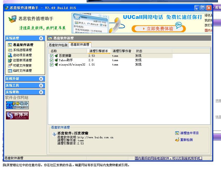 检测出有 baidu搜霸和雅虎助手和winsys16/winsys32 三个恶意程序,有时电脑偶尔自动跳出网页。 清除重启后一检测还有。。