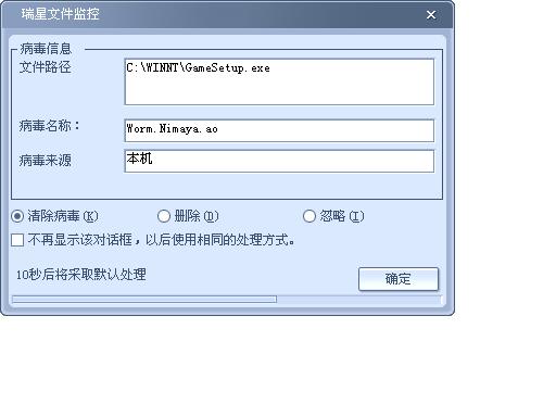 我现在瑞星的版本是19.08.12,现在总是发现C:\WINNT\Gamesetup.exe有病毒,但瑞星可以给删除,但删除完不一会儿又会发现此情况,已经删除了N次了,但还是不断出现,请高手指点如何解决???