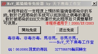 熊猫烧香免疫程序再次升级,针对根本,斩尽杀绝.不管你是否已中或未中熊猫烧香任何变种,本程序都能彻底清除,彻底免疫!