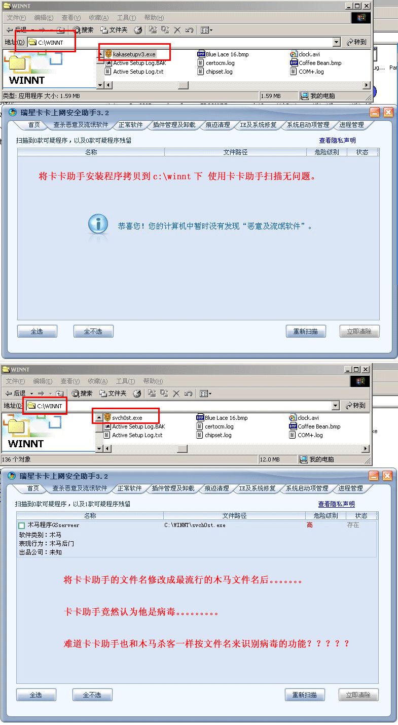 将任意文件拷贝到C:\WINNT下。修改文件名为svch0st.exe。卡卡竟然报有病毒。。。。。