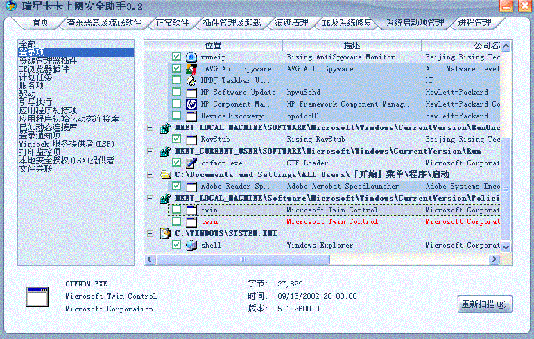而且其所属的文件ctfnom.exe在目录windows\system32中找得到,但是其属性是隐藏、系统,且无法取消隐藏,显示日期为2002年的文件,要删除的时候显示是系统文件。本来筐里显示的只有一个,但是被禁掉后不知什么时候又多出了一个,这个是不是病毒啊。。。。
