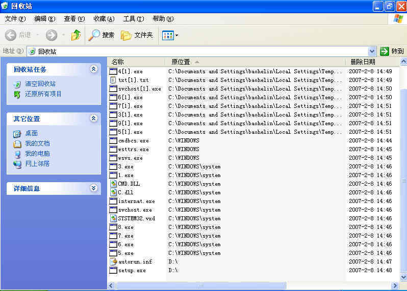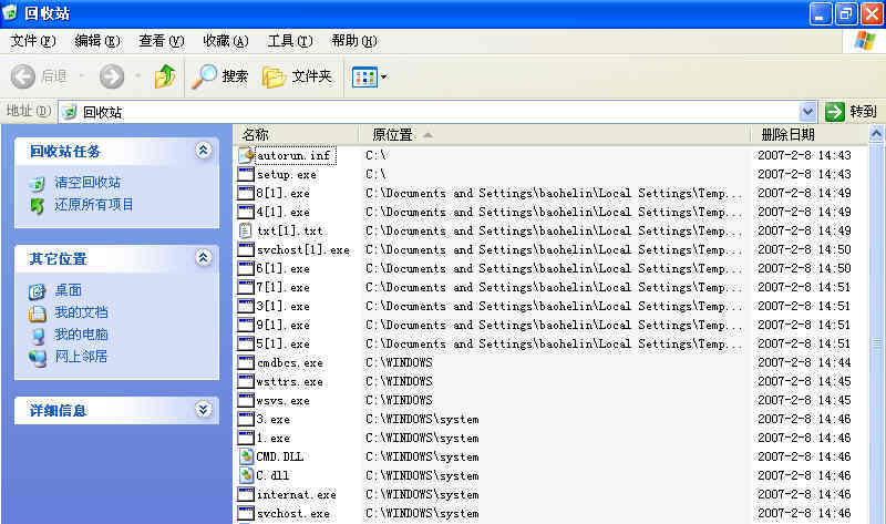 2、删除病毒文件(图2、图3。如果资源管理器看不到病毒文件,可以借助SREng。)。此毒还感染系统分区以外的可执行文件(被我的Tiny阻截了)。