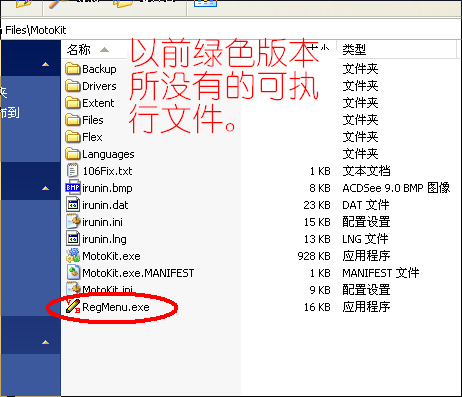 在motokit文件夹下找到一个可疑的可执行文件“RegMenu.exe”,这是以前绿色版本所没有的,将它删除不影响软件正常使用,但是问题也没有得到解决,请看下图。