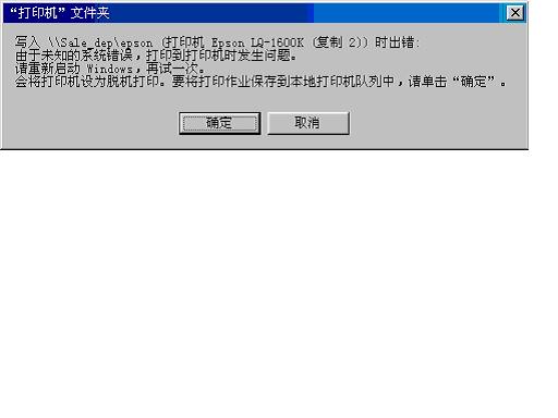 公司有几台针式打印机(LQ-1600KIII,LQ-1900KII,LQ-1600K),通过网络共享打印。最近通过网络共享打印机打印经常出现错误,错误见附图。而接打印机电脑本身打印则没问题。把接打印机电脑重装系统(WIN98)后共享打印机正常。但过几天又会出现同样的情况(以前没有出现过此问题,最近才出现的)。请问是不是病毒造成的。有谁遇到过这种情况啊!请高手帮忙.