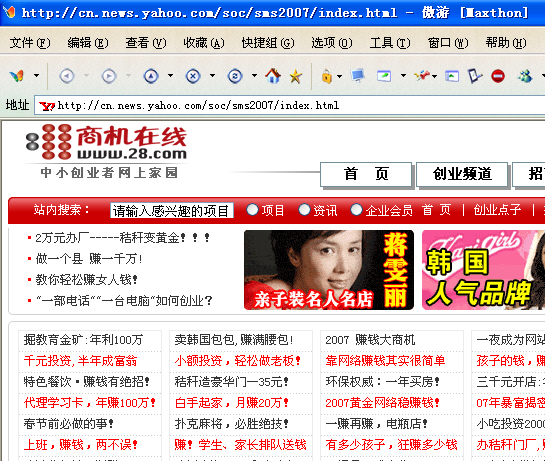 但是看一看,浏览器的地址栏中显示的依然是雅虎的站内地址(比如:http://cn.news.yahoo.com/soc/sms2007/index.html),