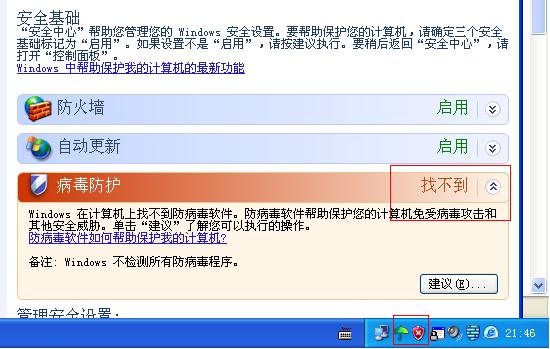 今天晚上打开电脑,忽然系统跳出提示说没有找到病毒防护,可是我的瑞星是最新的,难道瑞星和WINDOWS不兼容了吗?