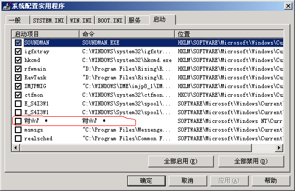 打开msconfig启动项总是看到一个是乱码的启动项目,见图,每次通过修改选项后重启电脑还是会出现勾选.晕,用卡卡助手和360卫士都查不出问题,瑞星2007升级到最新也发现不了任何问题.请帮忙看看