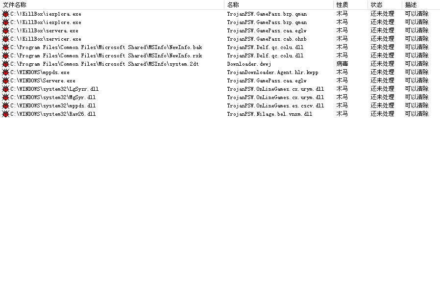 还是不托底,于是将硬盘挂再另一个没有问题的系统下进行查杀!这个系统使用的瑞星核对一下我们记录的木马信息!注册表关联项瑞星不会有提示,但是瑞星还是给我们几个新的木马信息多了几个DLL文件......