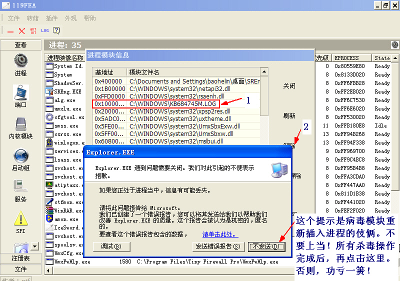 2、C:\windows\system32\DLMon.dll监控用户卸除病毒模块操作,一旦病毒模块被卸除,系统立即报错(Explorer.EXE遇到问题需要关闭.....)。此时,不要做任何回应。将报错窗口拖到一边,继续进行病毒模块卸除操作(图2)。