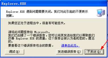 5、最后,再回应“Explorer.EXE遇到问题需要关闭...”对话框(点击“不发送”,图4)。