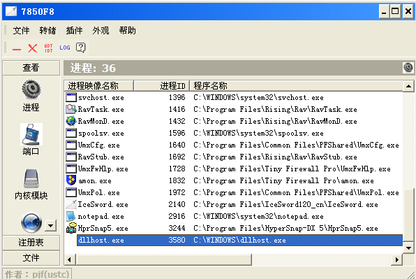 4、IceSword进程列表中可见病毒进程%windows%\dllhost.exe(非隐藏)。但“禁止进程创建”前,此病毒进程无法结束(图2)。