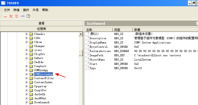 4、删除图3所示的病毒服务项(SRENG日志中也可见此服务项)。此外,HKEY_LOCAL_MACHINE\SYSTEM\CurrentControlSet\Services\SharedAccess\Parameters\FirewallPolicy\StandardProfile\AuthorizedApplications\List分支下的"C:\\windows\\dllhost.exe"="C:\\windows\\dllhost.exe:*:Enabled:dllhost.exe"也要删除。
