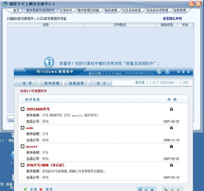 卡卡助手也很垃圾。你可以用windows清理助手来删除这个病毒。不过这个病毒对ie文件进行改写,如果你启动ie就会重新中毒,最好装卡巴删除一下。