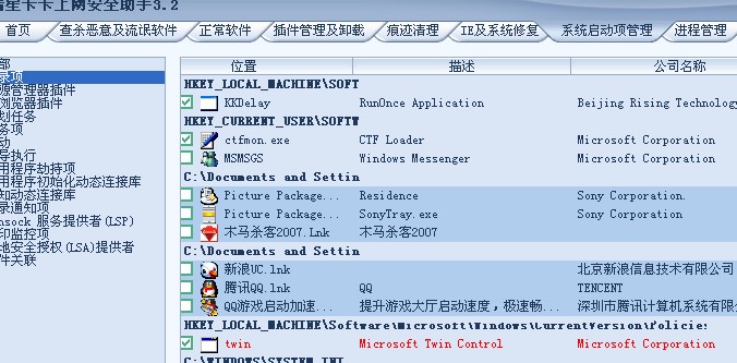 3.启动项中的<twin><C:\WINDOWS\system32\twunk32.exe> [Microsoft Corporation这个文件删不了。sreng里删后重新打开还有。