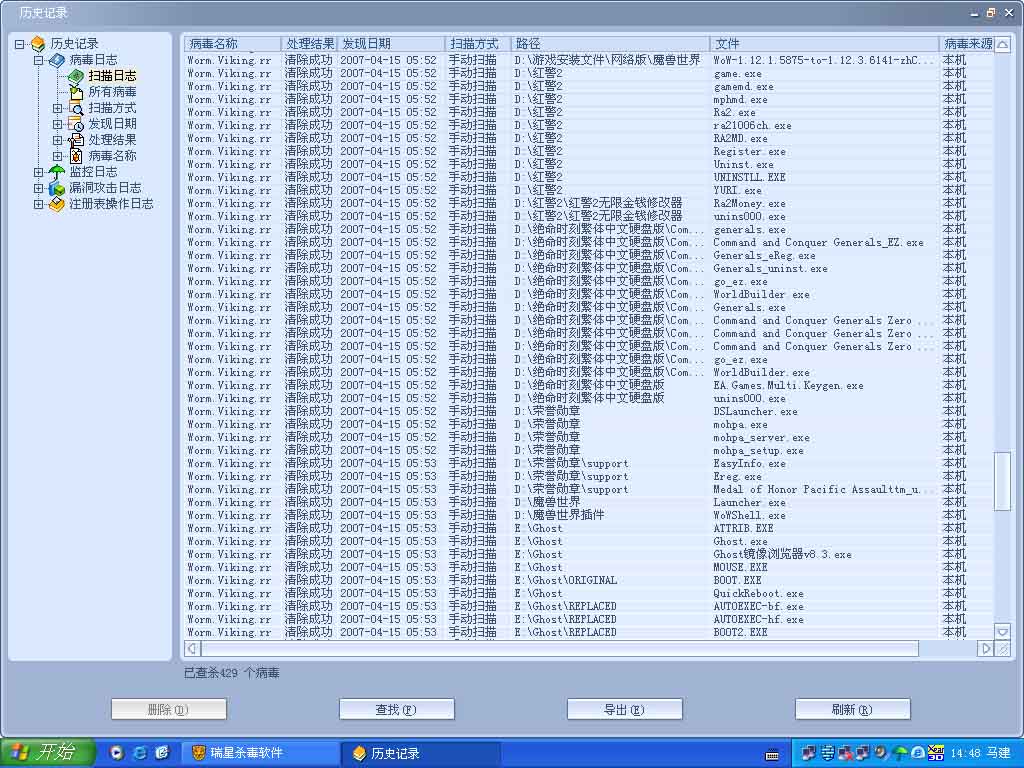 昨天做完系统后把瑞星升到最新版,扫描了一下其他盘,结果吓我一跳,所有的.exe文件都显示有这个病毒,不知道是不是正常,我都选的杀毒,不知道这些软件是不是还能用。还请斑竹或哪位高手帮帮忙看看怎么回事啊