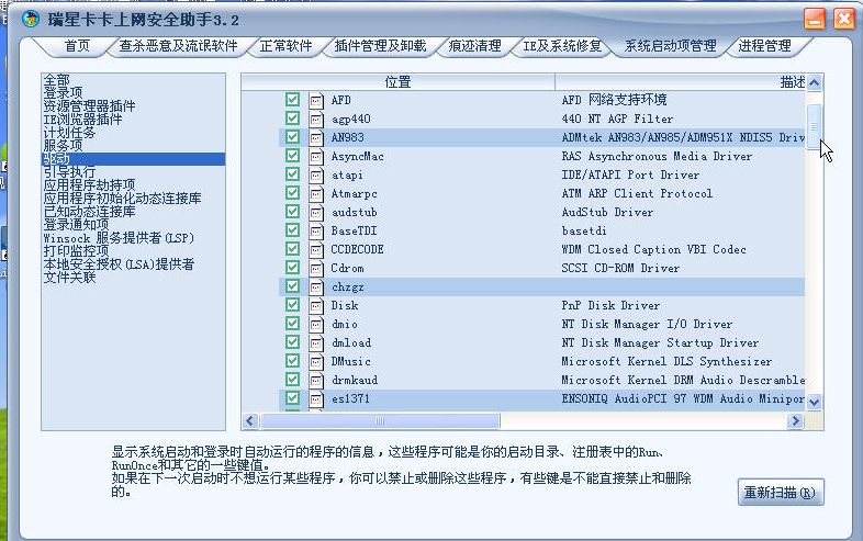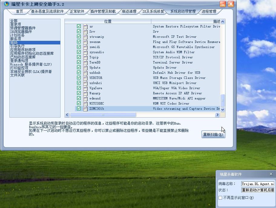 2、杀毒后再开机,开机扫描程序扫描未发现病毒,进入系统后,在用“卡卡”扫描发现“DHZGZ.SYS”病毒仍存在。