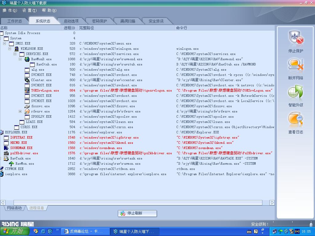 我先格C盘,重装系统,再把D盘有用的文件转到C盘(注:重装系统前用最新版瑞星杀过毒),再格D盘(我只有二个盘)。在玩游艺室戏时键盘操作迟钝,表现在:人物往前走不是想停就停,而是人物要碰到障碍物后或按一下反向键才能停下来。我用瑞星防火墙看了一下进程,有好些东东都出现了红色字(注:重装系统前也是这样)。请高手给我支招,我先谢了!!!