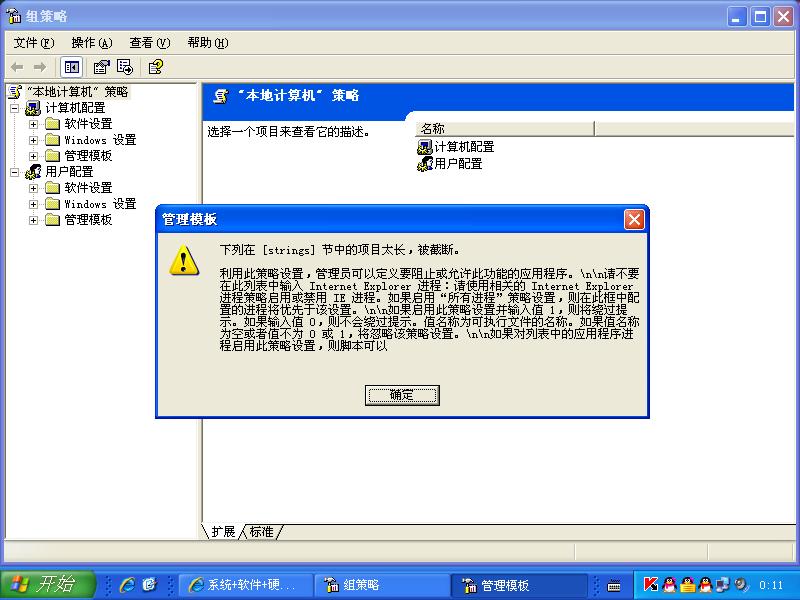 在开始菜单中的运行中填入gpedit.msc,按回车启动“组策略”,结果出现如下图片,不知是什么原因造成的,要一直狂点确定或关闭后才行。