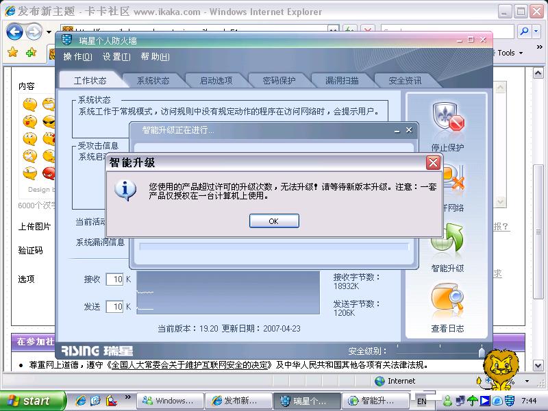 我购买的是正版光盘2007,可是从出现大大小小的问题!比如现在,我的瑞星防火墙早已无法升级!提示说我只能安装在一部机子上。我就是安在一部机子上呀?真是见了鬼了!