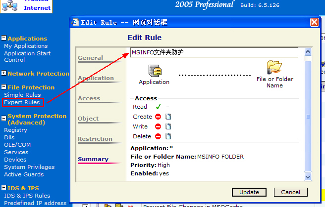 4、如果再在Tiny的Expert Rules中添加一条MSINFOR文件夹的防护规则(见图),这个worm.pabug.db就死掉了。
