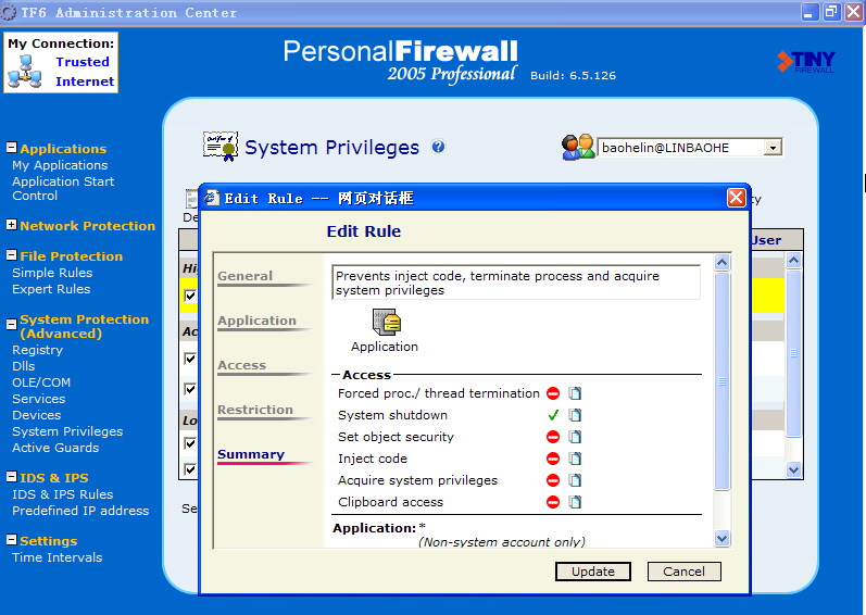 作为例子,下图是使用Tiny的System Privileges设置的一条相应防护规则。