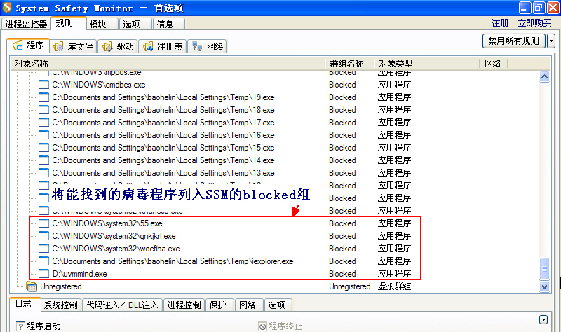此时,SSM可以将用户发现的病毒程序归入“阻止运行”组(图2)。