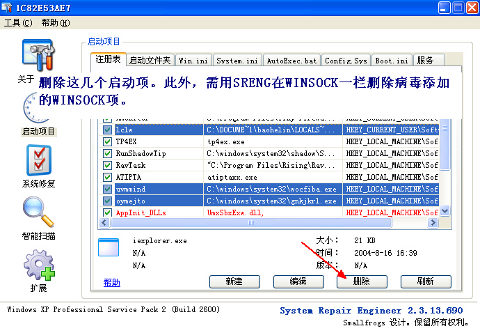 可以用改名的SRENG删除病毒启动项及WINSOCK劫持项(图5)。