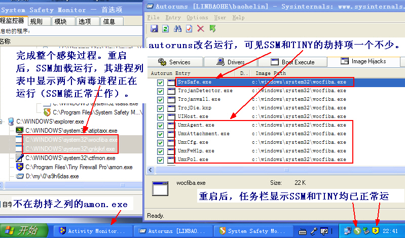 重启系统后,奇异现象出现了(图1)。表明worm agent.ug的部分IFEO劫持失败了(TINY和SSM可以正常运行),只有可怜的瑞星被此蠕虫劫持掉了。