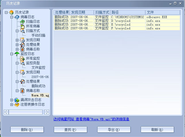 瑞星杀了D:\RECYCLED\INFO.EXE文件,认为这是worm.vb.agj病毒。