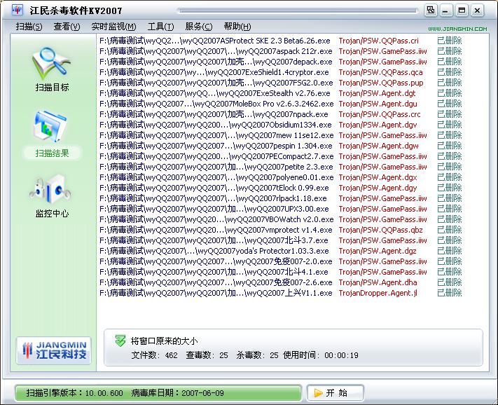 测试结果:江民病毒库版本2007.6.9  引擎版本10.00.600