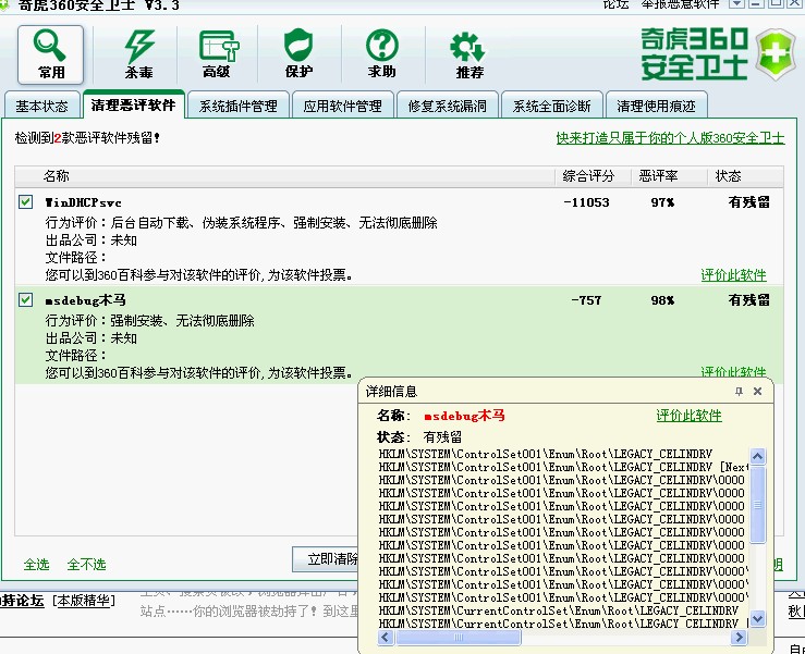 用360扫描出来清理,清理完了显示全部清理了,可重新启动还是有。。。