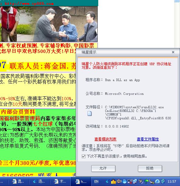 我的电脑装了全套瑞星正版软件,但现在总是无故弹出一些网页,每次出现的网页都不相同,一关闭这些网页瑞星监控提示Run a dll as an app,查看属性发现程序为 C://WINDOWS/RUNDLL32.EXE,这是什么病毒,怎麽结决啊?