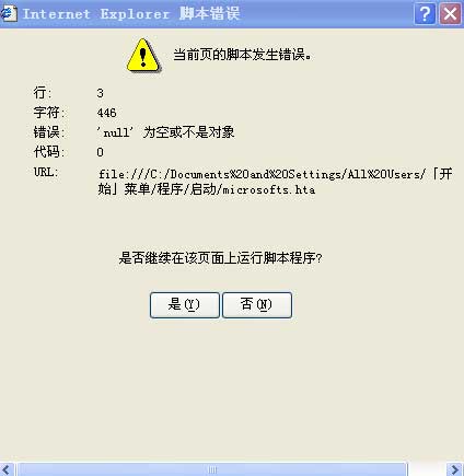 点击开始菜单/所有程序/启动/删除microsofts.hta
