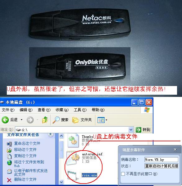 我有一个朗科的老式U盘(32M),不幸染上了rose.exe病毒,