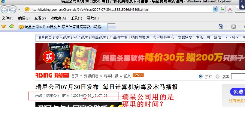 现在的时间是北京时间2007年9月29日08:36分,为什么瑞星的网站上就有发布在7月29日13:07分的文章,文章标题却是7月30日发布,我都看晕了啊